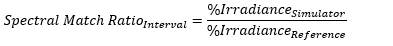 A solar simulator’s spectral match ratio is given by the its percentage output irradiance divided by the reference spectrum’s percentage output irradiance in each wavelength interval.
