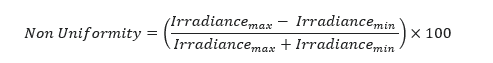 Spatial non-uniformity is a measure of how inconsistent the light output is over a target area. Natural sunlight is extremely uniform, owing to the sun’s great size and distance. Solar simulators attempt to approximate that uniformity. Deviation from perfect uniformity is determined using a formula as given below. Non-uniformity is reported in percent (%).
