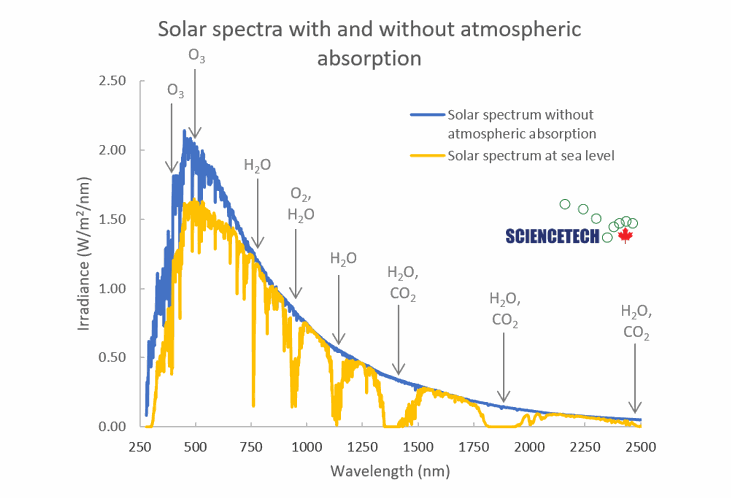The reference spectrum of AM0 (in space, at the edge of earth’s atmosphere) differs from the spectrum at ground level, as shown in