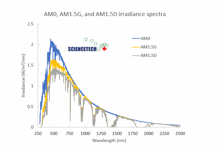 The effects of direct and diffuse radiation on a target are indicated using the labels AM1.5D and AM1.5G: