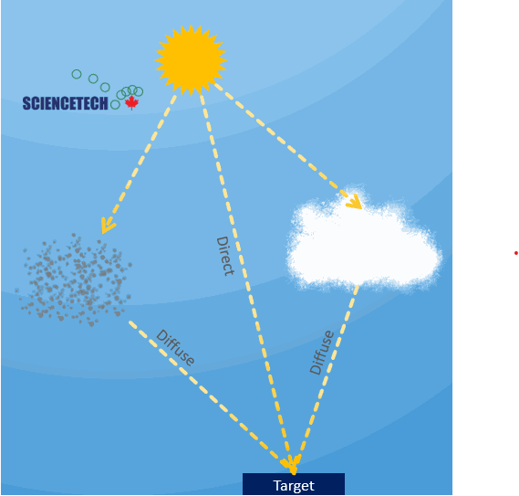 Figure 4. Direct and diffuse radiation. Diffuse radiation can be created by interaction with vapour, airborne particles, etc. Global radiation is the combination of direct and diffuse radiation received at the target.