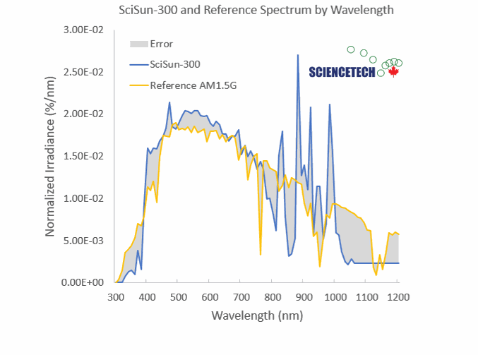 Figure 11. Error between SciSun-300 spectrum and reference AM1.5G spectrum. Gray shading represents the error quantified by the spectral deviation measurement (SPD).