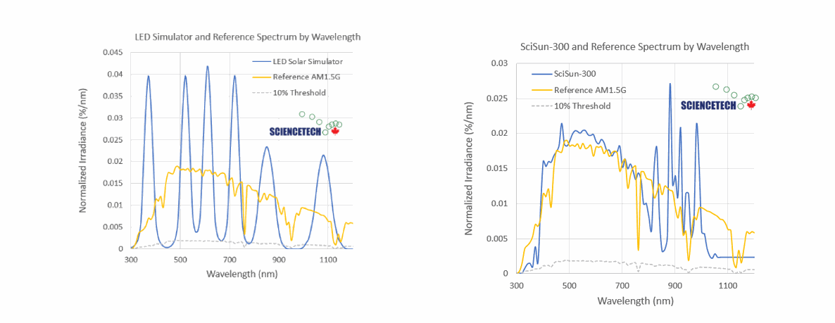 (Figure 10): a theoretical LED solar simulator and the xenon-arc-lamp-based SciSun-300.