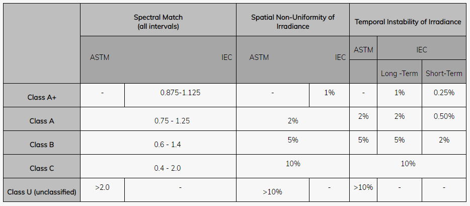 For IEC, the classification ratings, with respect to the first three dimensions above, are referred to in order. As an example, a solar simulator meeting Class A for spectral match, Class B for spatial non-uniformity, and Class C for temporal instability would be referred to as a Class ABC solar simulator(see table 5 for more information) .