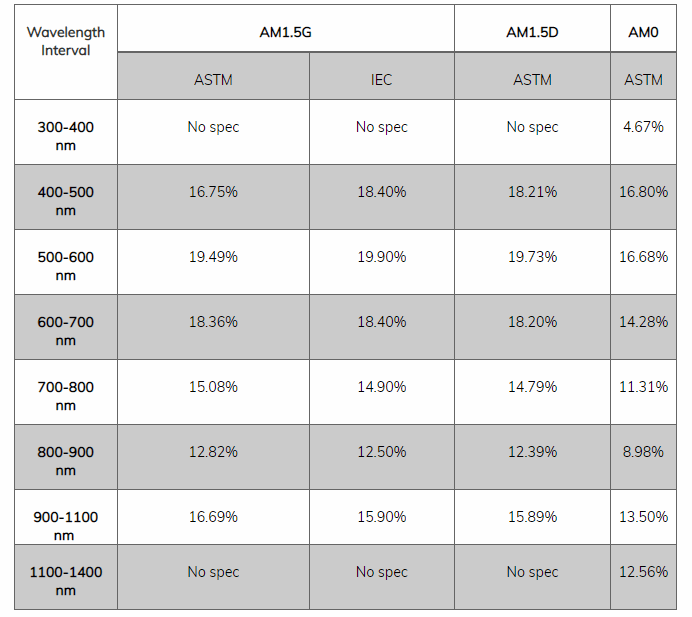 For three reference spectra, AM1.5G, AM1.5D, and AM0, the percentage of total irradiance produced in each wavelength is shown in Table 6 (for ASTM only). Note that wavelength intervals will differ for Class A+ classification according to IEC 60904-9.